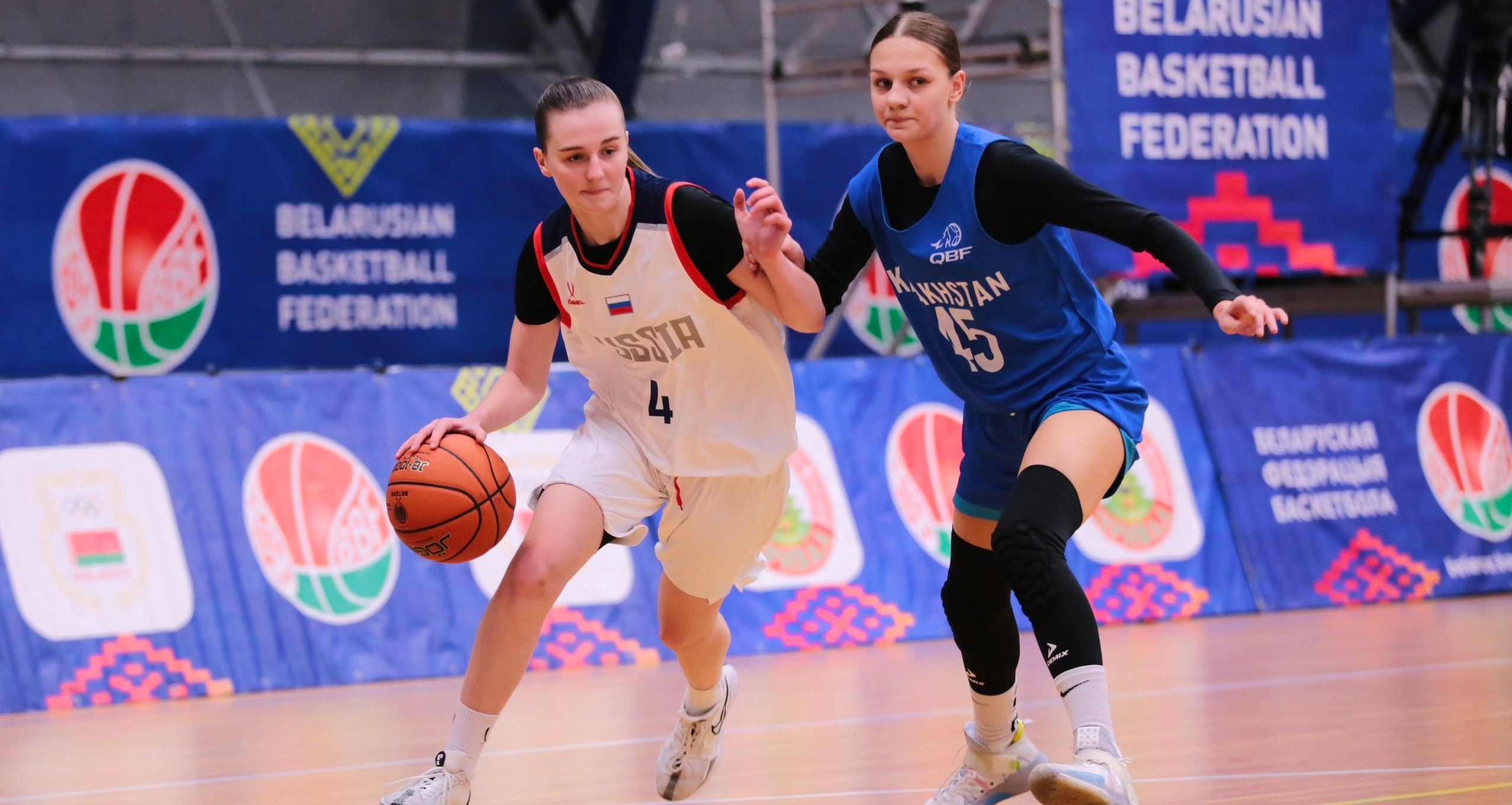 С первых секунд россиянки подтвердили статус неоспоримого фаворита встречи и ушли вперед на 14 безответных очков. Во время этого рывка старший тренер Казахстана успела воспользоваться тайм-аутом, но безрезультатно: поразить наше кольцо соперницам удалось лишь на четвертой минуте встречи, и к концу четверти они заработали лишь 6 очков против 39 от сборной России. В нашей команде на тот момент проявили себя почти все заявленные игроки: Анастасия Шубина отметилась шестью очками, Диана Краснощекова и Полина Михайловская набрали по 5, еще по 4 в свой актив записали Арина Шитникова, Виктория Курильчук, Диана Азарова, Юлия Натёкина и Камилла Горбановская. Во второй четверти Казахстан хоть и начал играть увереннее, показав лучший результат за десятиминутку (23:18), но уже не мог угнаться за россиянками после бодрого стартового отрезка. На большой перерыв команды разошлись при счете 62:24 в пользу России.